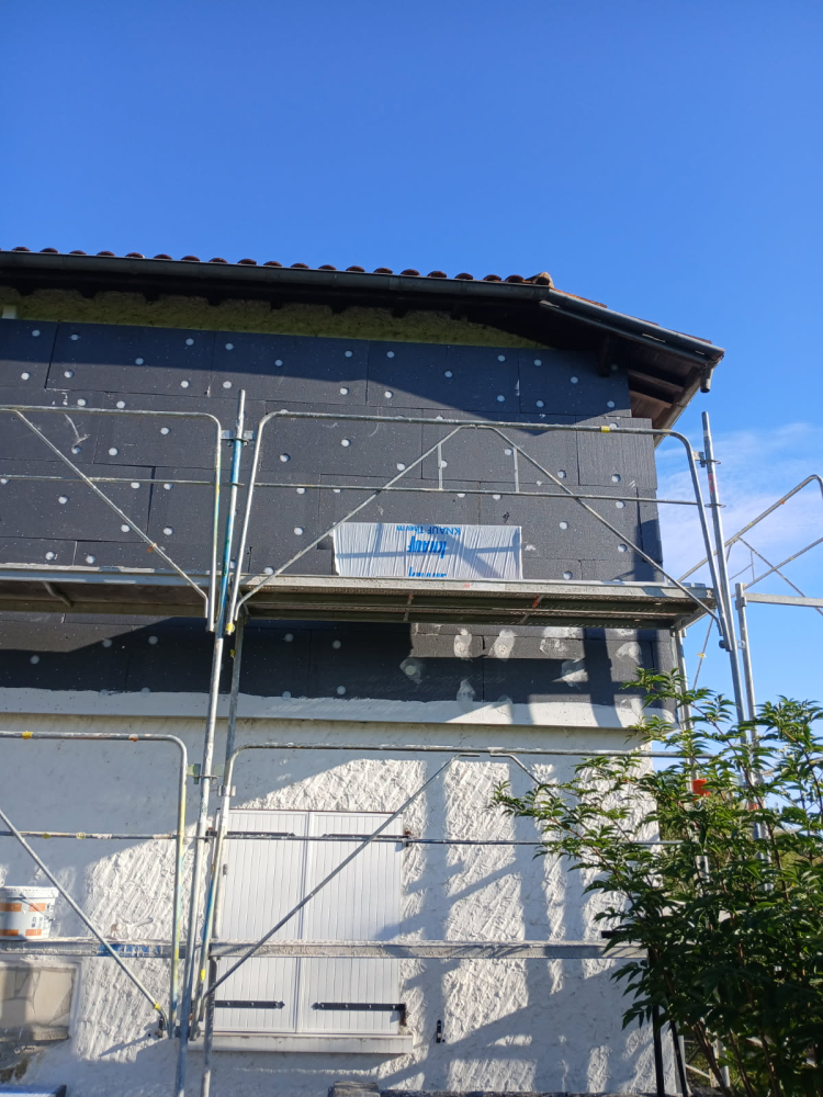 Lors d’un chantier récent, nos équipes ont procédé à la pose de panneaux de PSE (polystyrène expansé) fixés selon la technique du calé-chevillé. Cette méthode combine un collage précis des panneaux et une fixation mécanique par chevilles adaptées. C’est une étape essentielle pour garantir :
